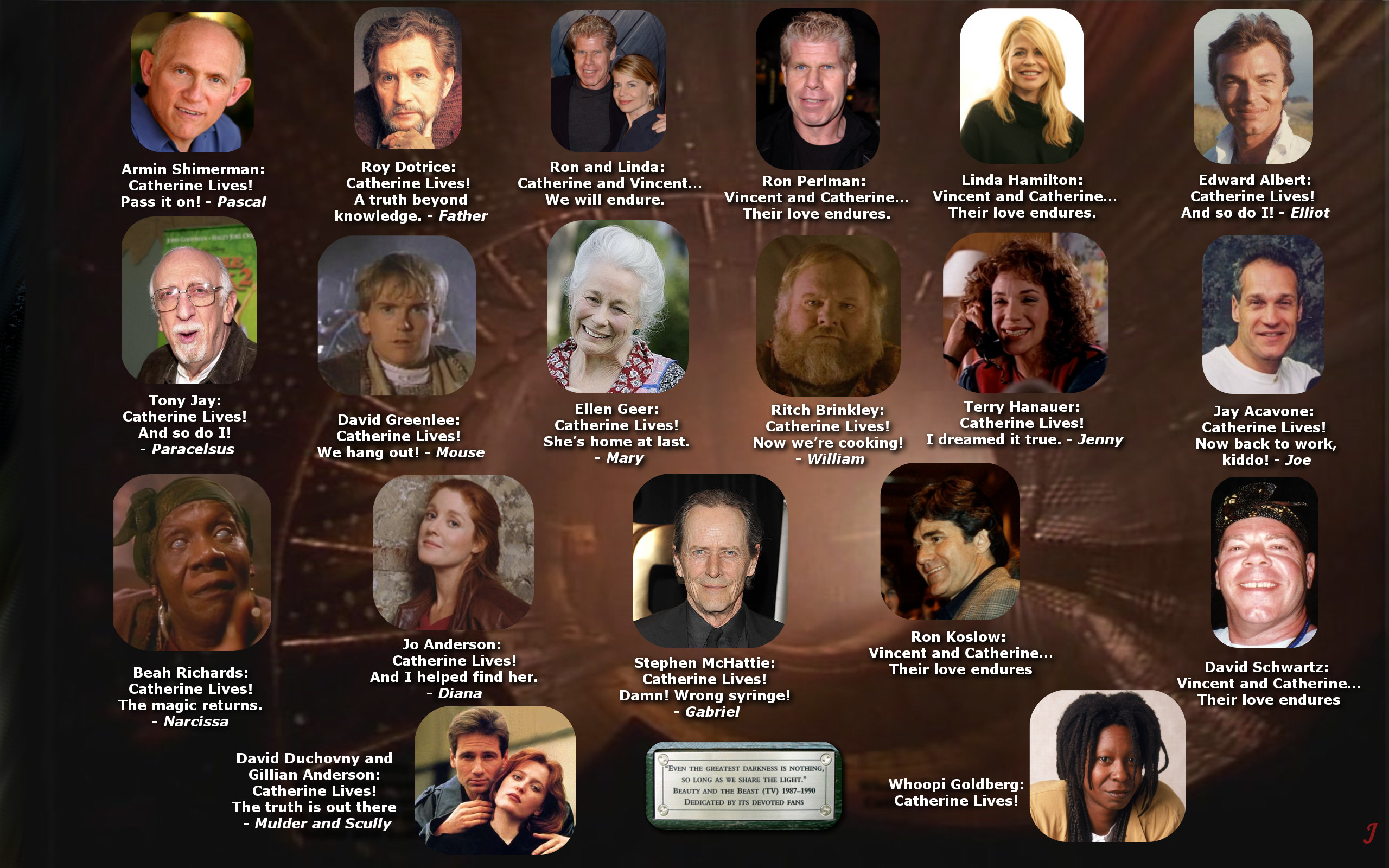 ![]() Linda Hamilton & Ron Perlman | ![]() Jay Acavone | ![]() Jo Anderson | ![]() Roy Dotrice |