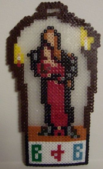 Two images made with fused "pixel" beads (11 to the inch). One has