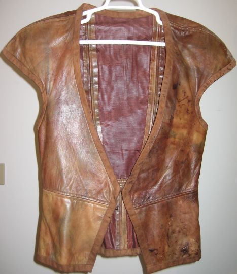 Description: Shiny brown leather vest with white frilly shirt worn by